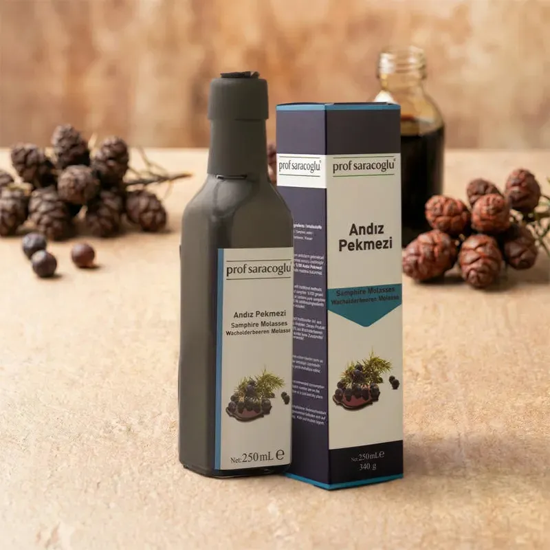 Mersin Bozyazı, Antalya Gazipaşa, Maraş Andırın ve Malatya Pütürge bölgelerinden (Türkiye) toplanan ardıç meyvelerinden üretilen ardıç pekmezi.