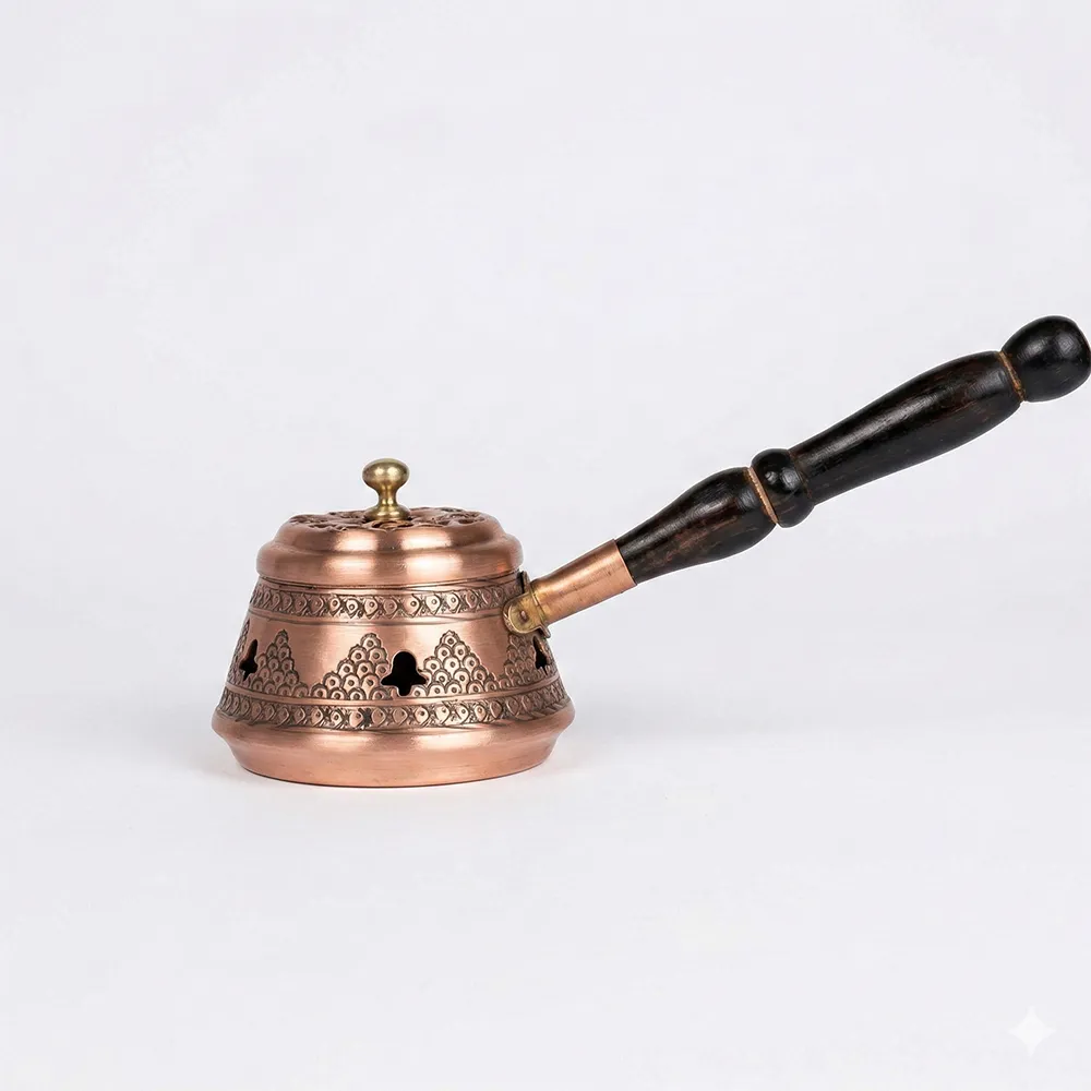 Bakır Tütsü ve Buhurdanlık – El İşi, ustaların geleneksel yöntemlerle hazırladığı özel bir dekoratif üründür. Dayanıklı bakır malzemeden üretilen buhurdanlık, hem tütsü hem de buhur yakmak için kullanılabilecek pratik ve estetik bir tasarıma sahiptir.