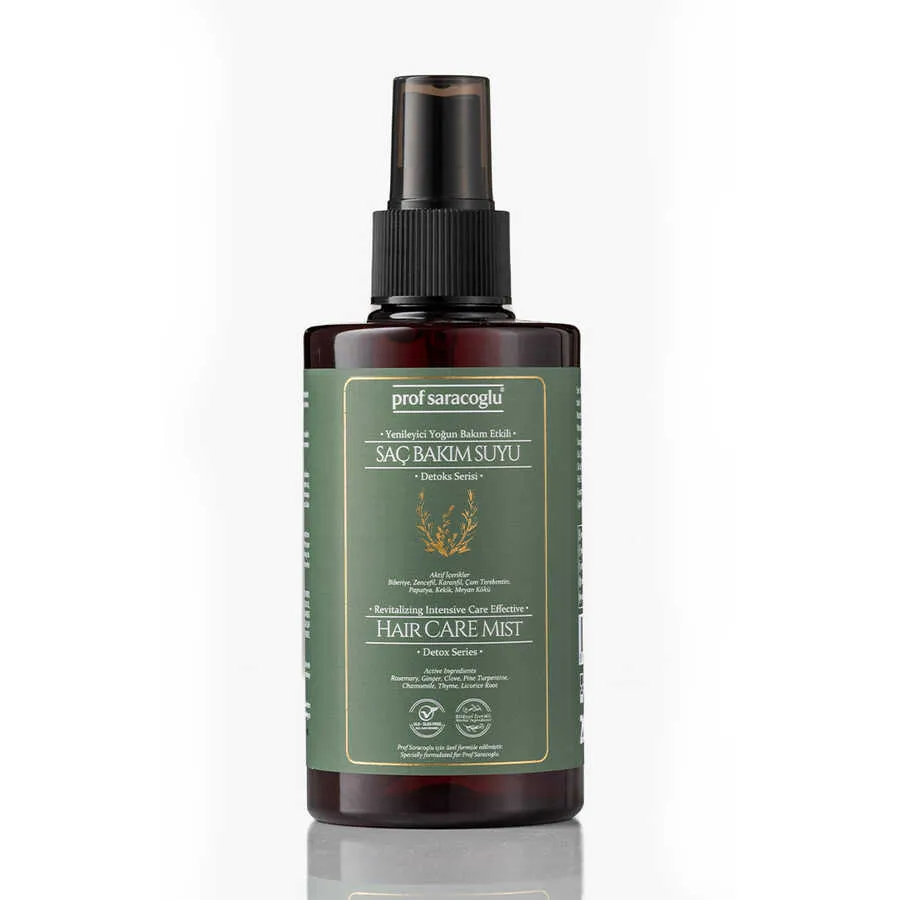 Detox Serisinin yeni üyesi olan Prof. Saraçoğlu Yenileyici Yoğun Bakım Etkili Saç Bakım Suyu ürünü; Biberiye, Zencefil, Karanfil, Çam Terebentin, Papatya, Kekik ve Meyan Kökü içeriğiyle özellikle ısıl işlem öncesi saçlarınızı korur. Elektriklenmeyi önlerken; Saçlarınızın parlak görünmesine yardımcı olur.✓ Formülündeki aktif bileşenler sayesinde saçlarınızın pürüzsüz, parlak ve canlı bir görünüme sahip olmasını destekler.✓ İçeriğindeki değerli Biberiye, Zencefil, Karanfil ve Çam Terebentin içeriği saç derinizin ve saçınızın onarılmasına yardımcı olur; Saç derisi sorunlarını önlemeyi hedefler. ✓ Saç ve saç derisinin ihtiyaç duyduğu yoğun, yenileyici nem bakımını sağlamayı hedefler.
