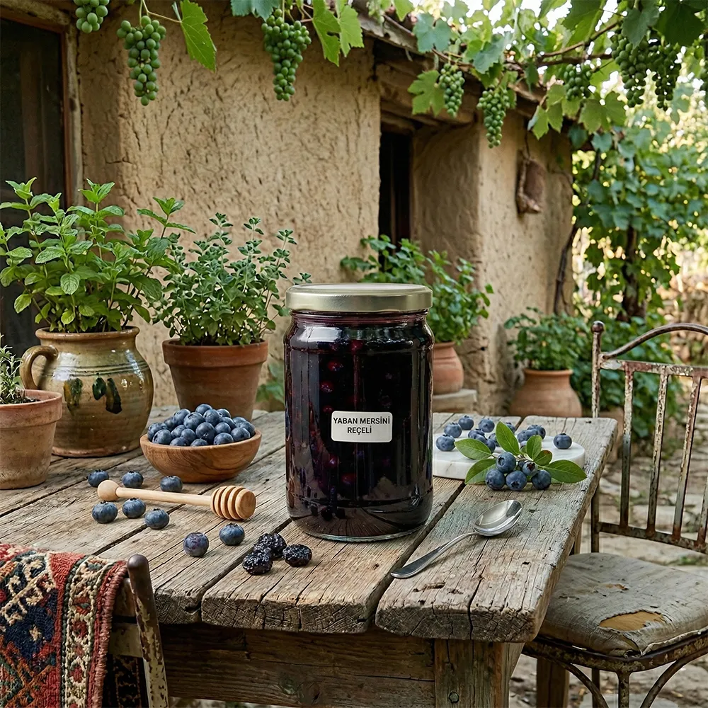 Yaban Mersini Reçeli, taze ve aroması güçlü yaban mersinlerinin uygun şeker oranı ile kaynatılması sonucu elde edilir. Meyvenin doğal rengi ve lezzeti korunarak hazırlanan bu reçel, hem klasik hem de modern sofralarda rahatlıkla yer bulur. Koyu mor rengi ve yoğun kıvamı ile hem görsel hem lezzet açısından dikkat çeker.